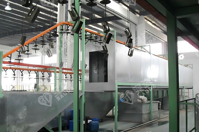 2. 前處理系統在線前處理,做到即處理即噴涂;瀑布均勻沖淋工件,型材表面處理均勻度高。